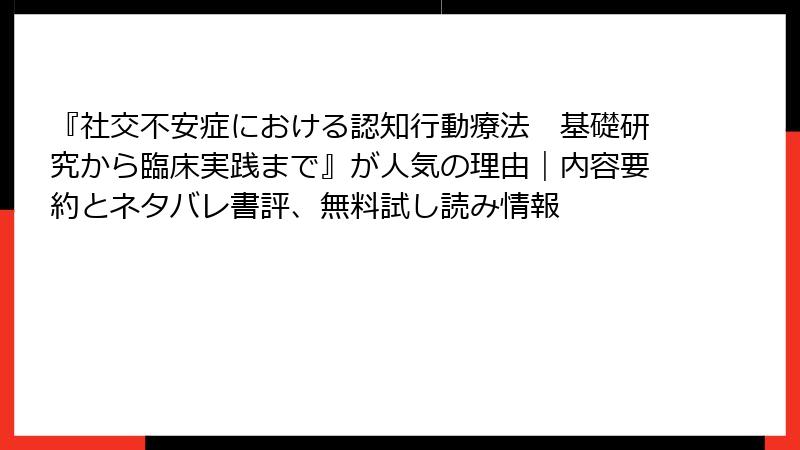 2025年に出版されたばかりの書籍「社交不安症における認知行動療法 基礎研究から臨床実践まで」(野田昇太監修)は、社交不安症の治療法を基礎研究から臨床実践まで網羅した専門書です。出版直後ということもあり、詳細なレビューや書評はまだ限定的ですが、オンライン上で見られる感想や考察を収集しました。ここでは、肯定的な意見を中心に、批判的な視点も探ってみます。全体として、専門家や興味を持つ読者から好意的に受け止められている印象ですが、具体的なフィードバックを詳しく掘り下げます。なお、批判的なレビューは現時点でほとんど見当たらず、書籍の難易度に関する言及も少ないです。