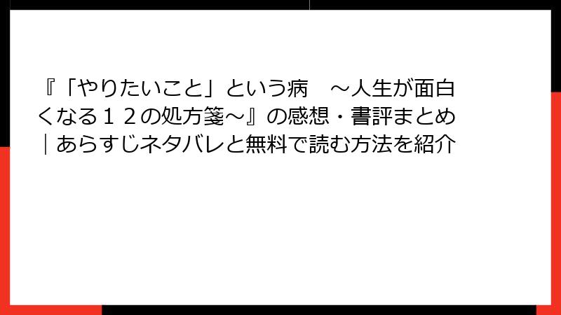 - 実践性: 「やりたいこと病」のコンセプトが新鮮で、人生観を変えるきっかけになったという声多数。
