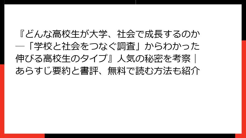 この書籍は、現代の教育現場で注目される高校生の成長プロセスを、長期的な調査データを基に深掘りした一冊です。高校から大学、社会への移行をテーマに、どのような生徒が成功するのかを科学的に解明します。以下では、調査の概要から具体的な分析結果、事例、そして実践的な示唆までを詳しくまとめます。ネタバレを含むため、書籍の核心部分にも触れています。