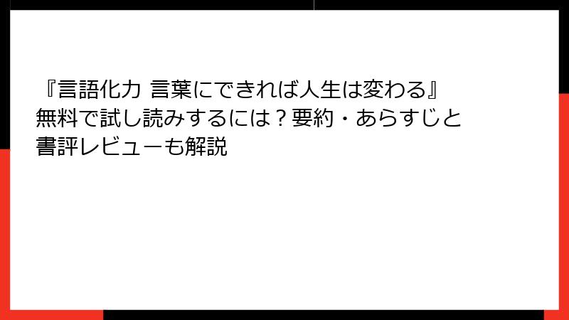 本書を無料で試し読みすることで、内容の雰囲気を掴み、購入するかどうかを判断できます。主に電子書籍プラットフォームが提供するサンプル機能を利用します。これにより、冒頭部分や目次、序章などを読むことが可能で、言葉の言語化プロセスが自分に合っているかを確認できます。試し読みは基本的にアカウント登録が必要ですが、無料でアクセス可能です。