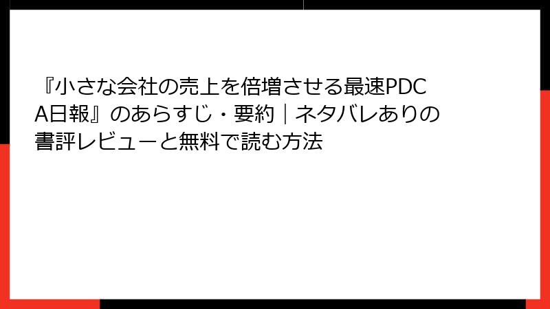 中司 祉岐氏の著書「小さな会社の売上を倍増させる最速PDCA日報」は、中小企業や個人事業主向けにPDCAサイクルを日報形式で実践する方法を提案した一冊です。発売以来、ビジネスパーソンからさまざまなレビューが寄せられており、肯定的な評価が多い一方で、批判的な声も存在します。本記事では、ネット上の感想や書評を基に、ポジティブな点、批判点、考察を詳しくまとめます。PDCA日報の導入を検討している読者にとって、参考になるはずです。