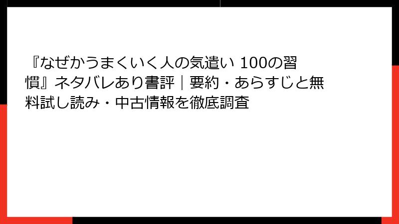 藤本梨恵子氏の人気書籍「なぜかうまくいく人の気遣い 100の習慣」は、気遣いの習慣をテーマにした実用書です。この本を無料で試し読みしたい場合や、中古版を探している場合の方法を詳しく解説します。2025年12月現在の情報に基づき、Kindleなどの電子書籍プラットフォームでの試し読みを中心に、中古市場の状況も調査しました。無料試し読みは気軽に本の内容を確認できる便利な手段で、中古版はコストを抑えたい人に最適です。以下でステップバイステップで説明します。
