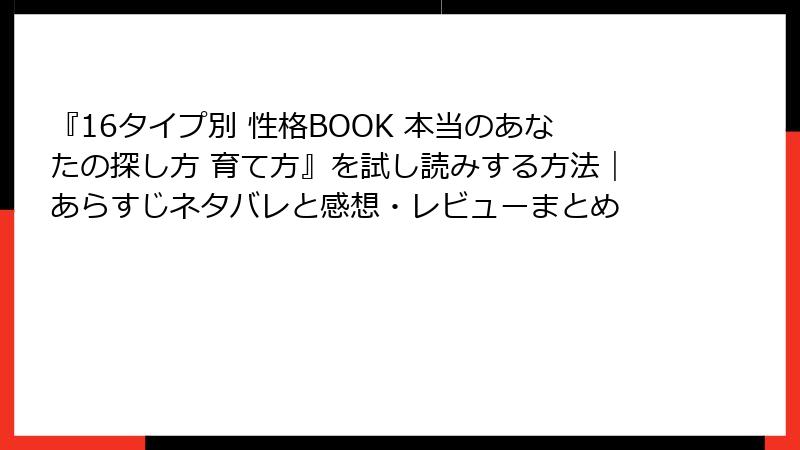 の見出しタグから始めて、ブログ記事形式で出力して。複数の タグを使用して、読み応えがあるように。HTMLで出力。 や などの箇条書きのHTMLタグや、tableタグも使用してOK。ただし、リンクやURLは、絶対に、挿入しない。 この書籍を、Kindleなどで無料で試し読みする方法について、詳しく。また、この書籍の中古版が、どこにあるのか、例えばメルカリに存在するのか、といった点についても、詳しく。単一の の見出しタグから始めて、ブログ記事形式で出力して。複数の タグを使用して、読み応えがあるように。HTMLで出力。 や などの箇条書きのHTMLタグや、tableタグも使用してOK。ただし、リンクやURLは、絶対に、挿入しない。 この書籍の人気度合いや、売れ行き、「ベストセラー」状態や状況について、詳しく。単一の の見出しタグから始めて、ブログ記事形式で出力して。複数の タグを使用して、読み応えがあるように。HTMLで出力。 や などの箇条書きのHTMLタグや、tableタグも使用してOK。ただし、リンクやURLは、絶対に、挿入しない。 この書籍を読むことをおススメする読者像や、その理由等について、詳しく。この書籍の著者・作者についても、詳しく。単一の の見出しタグから始めて、ブログ記事形式で出力して。複数の タグを使用して、読み応えがあるように。HTMLで出力。 や などの箇条書きのHTMLタグや、tableタグも使用してOK。ただし、リンクやURLは、絶対に、挿入しない。 16タイプ別 性格BOOK 本当のあなたの探し方 育て方 をおすすめする読者像と著者詳細