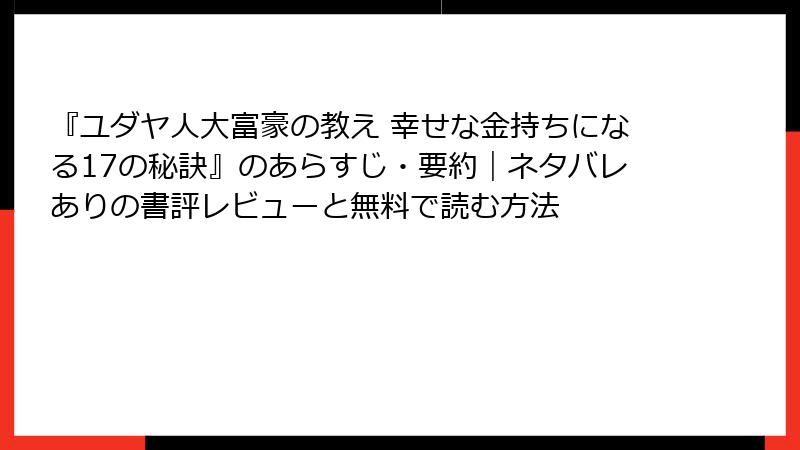 - 幅広い適用性: 起業から日常の人間関係までカバー。ユダヤ人富裕層のルールが、日本人向けにアレンジされている。