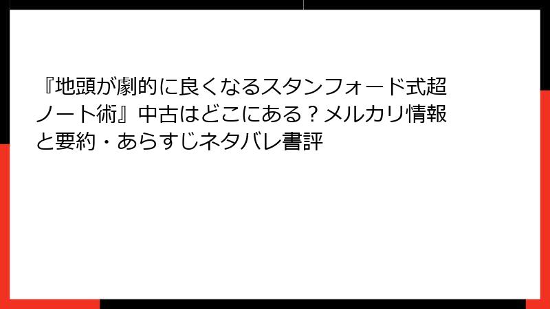 『地頭が劇的に良くなるスタンフォード式超ノート術』中古はどこにある?メルカリ情報と要約・あらすじネタバレ書評