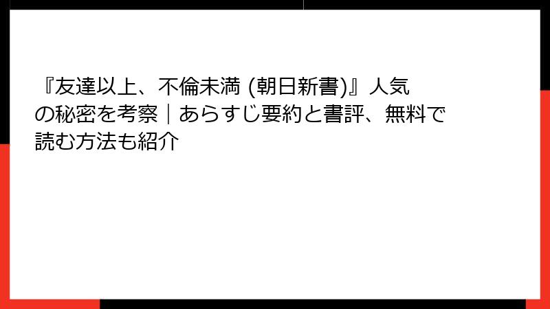秋山謙一郎の書籍『友達以上、不倫未満 (朝日新書)』は、現代の人間関係をテーマにした興味深い一冊です。この本を気軽に試してみたい方や、安く手に入れたい方のために、無料試し読みの方法と中古版の入手先について詳しく解説します。電子書籍を中心に、さまざまなプラットフォームを活用したアプローチを紹介します。なお、情報は2025年12月時点のものですので、最新の状況を確認することをおすすめします。