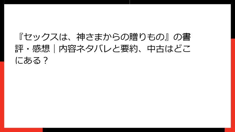 これらの批判は、書籍のユニークさを逆手に取ったもので、読者の期待値とのミスマッチから生じているようです。特に、セックスを神の贈り物として位置づける視点が抽象的すぎて、具体的なアドバイスを求める人には物足りないという意見もあります。