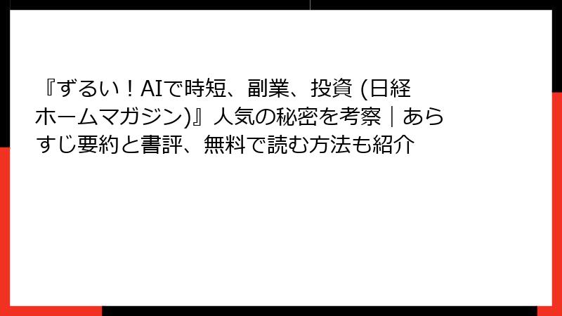 レビューから、内容がお金やリソースのある人向けで、日常適用しにくいとの指摘あり。ネタバレとして、AI副業や投資の例に初期投資が必要なケースが多く、即時試せる実例が少ない点が弱み。ただし、プロンプト術や時短Tipsはすぐに活用可能で、全体としてAIの「ずるい」使い方を学べる一冊です。AIの進化を活かした実践書として、ビジネスパーソンにオススメ。