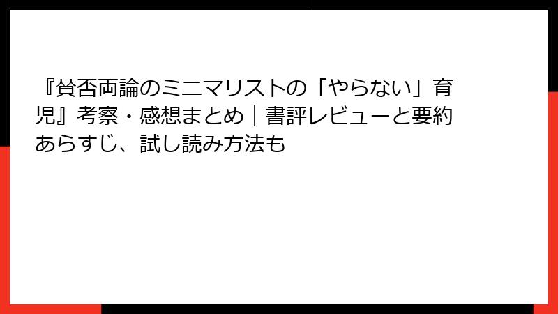 レビューが少ない今、読む価値は著者のファンやミニマリスト志向の親にあります。将来的に批判が増えれば、より議論を呼ぶ一冊になるでしょう。子育て中の人、肩の力を抜きたい人にオススメ。批判を恐れず、自分のスタイルに取り入れるのが本書の精神です。