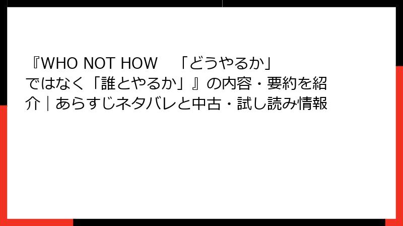 『WHO NOT HOW 「どうやるか」ではなく「誰とやるか」』の内容・要約を紹介|あらすじネタバレと中古・試し読み情報