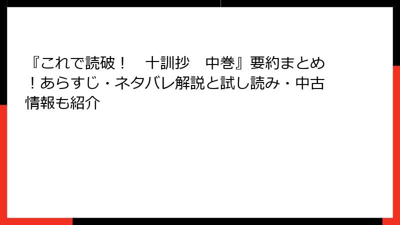 「これで読破! 十訓抄 中巻」は、鎌倉時代の古典『十訓抄』を現代語で解説した電子書籍で、主にKindle形式で提供されています。この書籍は古典の入門書として位置づけられ、友情や忠義などのテーマを扱っています。無料試し読みは電子書籍の利点を生かした方法が多く、中古版については電子書籍のため物理的な中古品が限定的ですが、関連する入手経路を調べました。以下で詳しく解説します。