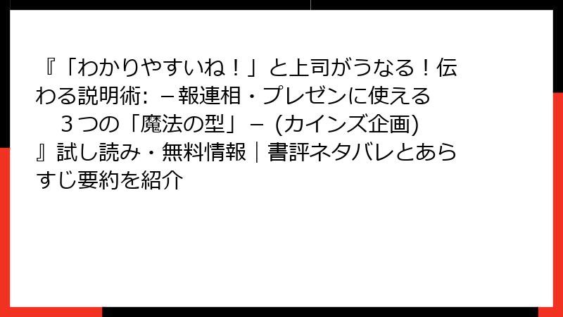 この書籍は、ビジネスシーンで欠かせない報告・連絡・相談(報連相)やプレゼンテーションを効果的に行うための実践的なガイドです。著者の海津佳寿美氏は、コミュニケーションの専門家として、相手に伝わりやすい説明のコツを「3つの魔法の型」というフレームワークにまとめています。本書は、説明が苦手な人でもすぐに活用できるように、具体例を交えながらステップバイステップで解説。ネタバレを含む詳細な要約として、書籍の構造と核心部分を深掘りします。