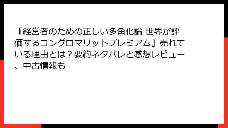 - 人気出品例: 「経営者のための正しい多角化論 : 世界が評価するコングロマリットプレミアム」として、定価ベースの値下げ品。