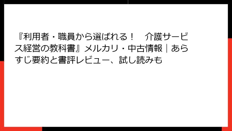 介護事業経営者や、管理者、業界新人におすすめ。理由は、利用者・職員中心の経営ポイントで、稼働率向上や人材確保が学べ、選ばれる施設運営が可能になるため。