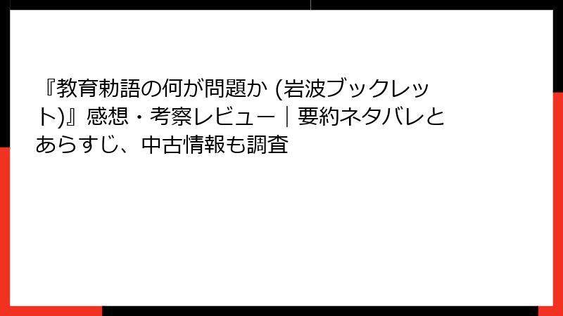 - 教育史研究の成果をコンパクトに: 教育勅語が「天皇と国民の道徳的一体性」という仮想を求めている点を納得した読者が多く、解釈論争や植民地での取り扱いを興味深く読んだという感想。衆参両院の決議も一読を勧めています。