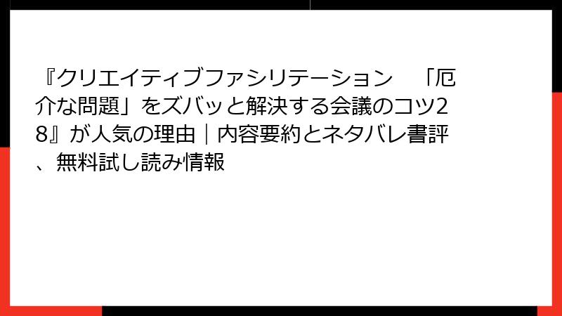 『クリエイティブファシリテーション 「厄介な問題」をズバッと解決する会議のコツ28』が人気の理由|内容要約とネタバレ書評、無料試し読み情報