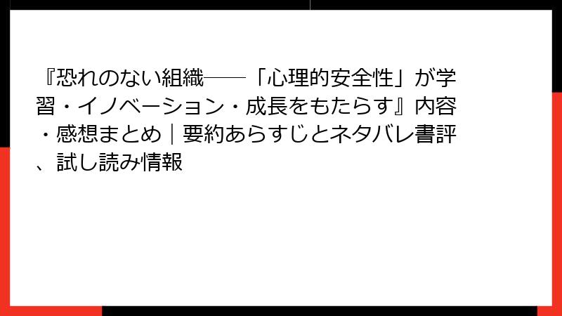 『恐れのない組織――「心理的安全性」が学習・イノベーション・成長をもたらす』内容・感想まとめ|要約あらすじとネタバレ書評、試し読み情報