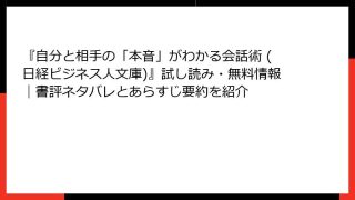ビジネス実用 『自分と相手の「本音」がわかる会話術 (日経ビジネス人文庫)』試し読み・無料情報|書評ネタバレとあらすじ要約を紹介
