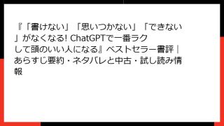 ChatGPT&生成AI 最強の仕事術 ―すぐに役立つ「AIツール100選」― の徹底レビュー:AI時代を生き抜くための実践ガイド 生成AIの波がビジネスシーンを席巻する中、この書籍はまさにタイムリーな一冊。2023年7月に日経BPから出版...