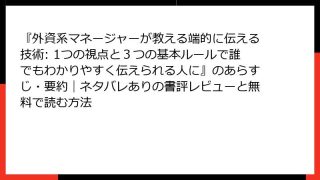 ビジネス実用 『外資系マネージャーが教える端的に伝える技術: 1つの視点と3つの基本ルールで誰でもわかりやすく伝えられる人に』のあらすじ・要約|ネタバレありの書評レビューと無料で読む方法