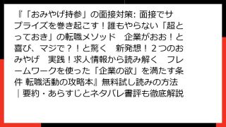 ビジネス実用 『「おみやげ持参」の面接対策: 面接でサプライズを巻き起こす!誰もやらない「超とっておき」の転職メソッド 企業がおお!と喜び、マジで?!と驚く 新発想!2つのおみやげ 実践!求人情報から読み解く フレームワークを使った「企業の欲」を満たす条件 転職活動の攻略本』無料試し読みの方法|要約・あらすじとネタバレ書評も徹底解説