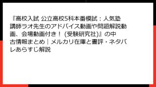 教育学 『高校入試 公立高校5科本番模試:人気塾講師ラオ先生のアドバイス動画や問題解説動画、会場動画付き! (受験研究社)』の中古情報まとめ|メルカリ在庫と書評・ネタバレあらすじ解説