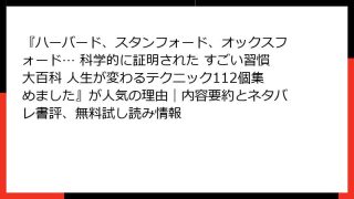 倫理学・道徳 『ハーバード、スタンフォード、オックスフォード… 科学的に証明された すごい習慣大百科 人生が変わるテクニック112個集めました』が人気の理由|内容要約とネタバレ書評、無料試し読み情報