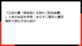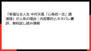 書籍「幸せな人は知っている「人生を楽しむ」ための30法則」の詳細なあらすじと要約 小林正観氏のこの書籍は、人生を「修行の場」として苦しむのではなく、楽しむための視点を提供します。2011年に逝去した著者が残した教えを基に、30の法則を通じて...