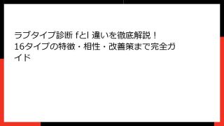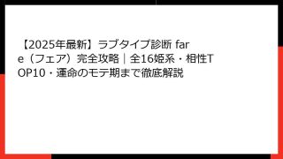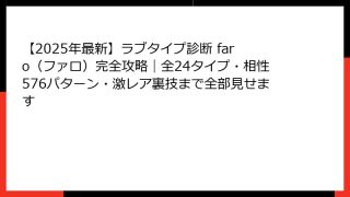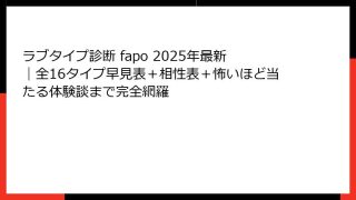 ラブタイプ診断『LARE(ラレ)』とは?2025年最新版で話題沸騰中の恋愛診断を徹底解説! 「ラブタイプ診断 lare」で検索したあなたが最初に知りたいこと全部お答えします 2025年現在、恋愛診断界で最も熱いキーワードといえば間違いなく「...