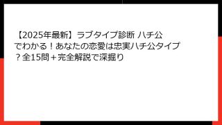 ラブタイプ診断とは?ハチ公の物語から学ぶ恋愛の忠実さ 恋愛というものは、人々を魅了しつつも、時に複雑で予測不能なものとして私たちの心を揺さぶります。 あなたは今、どんな恋愛スタイルをお持ちでしょうか?もしかすると、渋谷の象徴であるハチ公のよ...